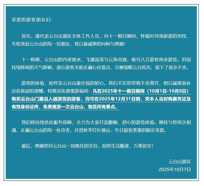 FPGA加速-因持续降雨影响体验,河南云台山宣布十一假期入园游客年内可免费重游一次,网友呼吁华山和泰山等景区跟进 均可在2025年12月31日前-自动扩展-本尊科技